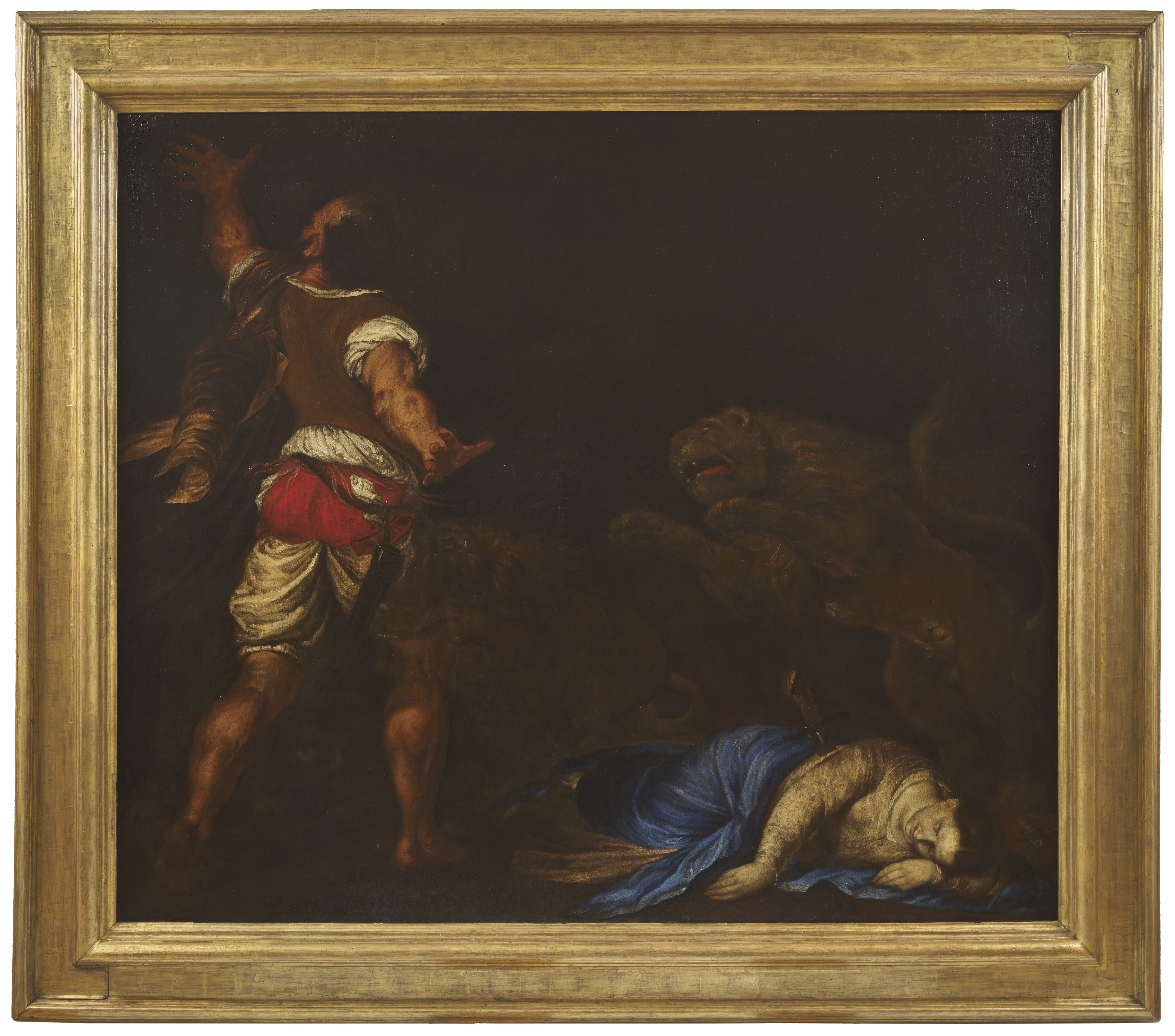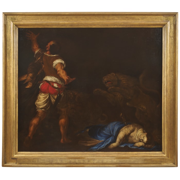 The subject is rarely treated in painting. It illustrates the martyrdom of Saint Euphemia, described in detail by Jacopo da Voragine in the Golden Legend. The episode takes place at the time of Diocletian and the early Christian martyrs. After several unsuccessful attempts to eliminate Euphemia, who did not wish to abjure her Christian faith, she was thrown "into a pit where there were three wild beasts so ferocious that they would swallow any man", but amazingly they did her no harm. An executioner was then sent to drive "his sword into Euphemia's side, thus making her a martyr for Christ. To reward the headsman for his service, the judge draped him in a silk garment and girded him with a gold belt, but as the man went out, he was snatched by a lion and devoured by the same"3. Indeed our painting shows this man seen from behind, his arms raised in surprise at the sudden attack, and an empty scabbard on his waist; given the presence of the sword in the saint's side, it is not difficult to deduce that he has just committed the cruel act himself. Stories about martyrs naturally lend themselves to the spectacular, and here the artist has taken advantage of the theatrical element, concentrating more on action than decorum. The dark background thrusts the two figures into the immediate foreground, arranged along two contrasting horizontal and vertical diagonals. Two of the pieces of clothing worn by the richly-dressed executioner -the strange short red breeches and twirling beige doublet - evoke the gift of the "silk garment" mentioned in the Golden Legend.
