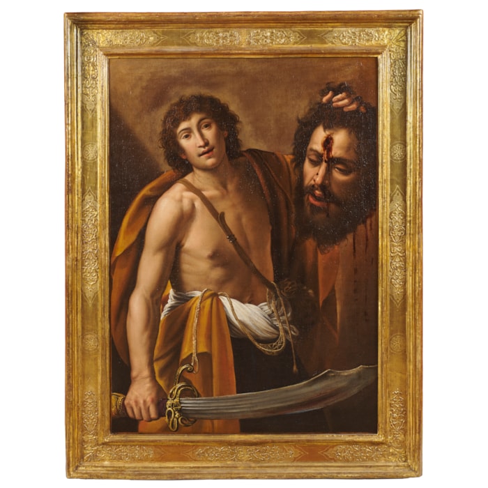 Our painter has resolutely aimed for a restrained level of drama, putting the accent on decorum. Attention is given to the descriptive details of the sling and the decorated pommel and handguard of the sword that crosses the foreground. The background is defined by a distinct diagonal line of shadow, revealing fidelity to the language of Caravaggio, also visible in the crimson blood-streaks that lend the scene its naturalism. Soft lighting and bronze tonalities, modulated by lighter tawny browns, surround the protagonists with warm colour.