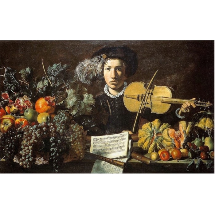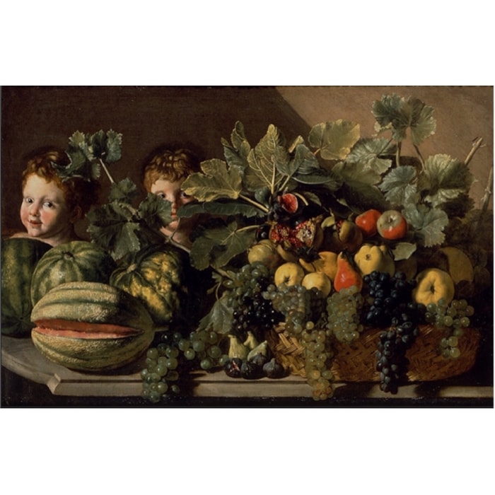 Until then, the painter was thought to be responsible for some still life scenes with figures, such as the ambitious Still Life with Violinist (Fig. 1; 82 x 126 cm, whereabouts unknown) and the privately-owned Still Life with two Putti (also known as the Sangalli Still Life; Fig. 2), which both contain beautiful fruit baskets with bunches of grapes draped across their edges, as in our composition.