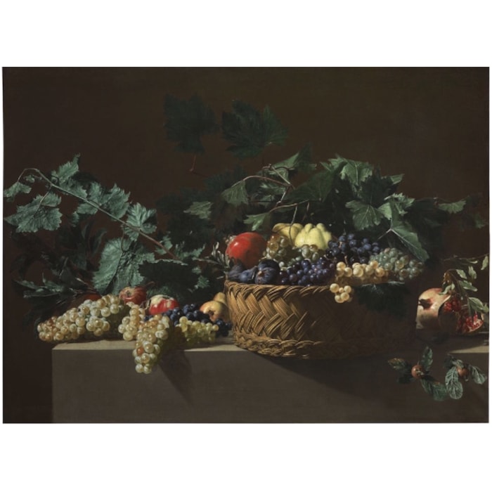 The artist shows off various kinds of grapes on the outer side of the basket, moving from black to white ones, as if to accentuate the effect of proximity to the beholder enabled by this tight-knit framing. Just as in Cavarozzi’s Supper at Emmaus (Los Angeles, The Getty Museum), vine tendrils spring from behind the basket of grapes set in the immediate foreground, balanced on the very edge of the table. The sumptuous presentation of items of fruit on three levels, with apples and a pomegranate on the top of this unlikely stacking, is entirely typical of the artist.