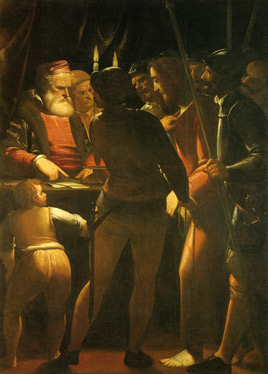Here, the candle flame casts a pallor on the calm, resigned face and bust of Christ, thus accentuating the dramatic effect; the light also defines the child who turns towards him, carrying bundles of switches for the flagellation under his right arm. Behind, the figures of his tormentors – synonymous with evil – are deliberate caricatures, their faces furrowed with exaggerated expressions and emphatic features, as found in the background of the Christ before Caiaphas.