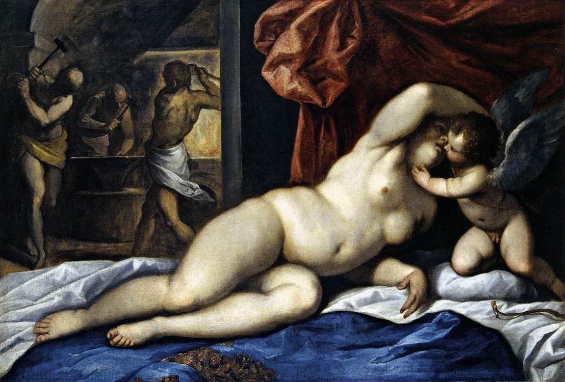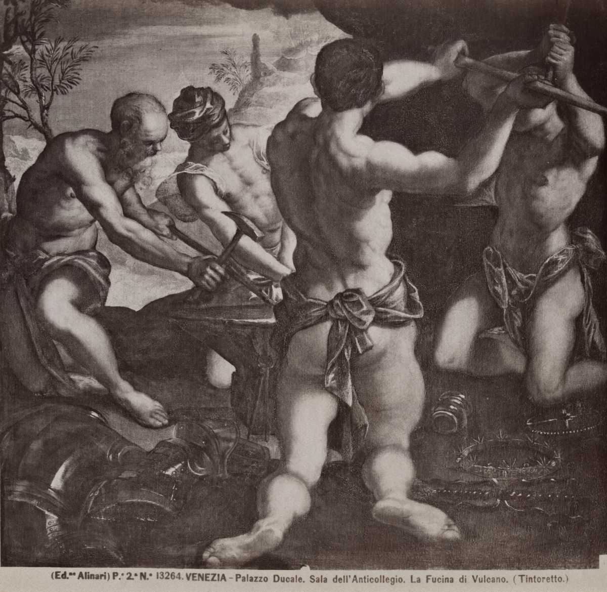 L’equilibrio della scena è tutto costruito sull’opposizione di contrari: cromatici, estetici, sociali, di genere e d’azione. A sinistra lo sguardo è attratto dalla pelle chiara delle quattro divinità con i capelli dorati. Venere, in particolare, ha i riccioli biondi raccolti in un’acconciatura a mezzaluna di gran moda tra le dame veneziane di fine Cinquecento e resa ancor più elegante da uno splendido gioiello. A destra, il gruppo degli uomini della fucina che sembrano gli unici a subire il calore del fuoco. La posizione dell’uomo in primo piano, di schiena, crea una linea quasi parallela a quella del corpo di Venere stabilendo così una sorta di continuità tra le due metà contrapposte: un gioco di echi rinforzato dall’utilizzo del rosso alle due estremità della composizione.