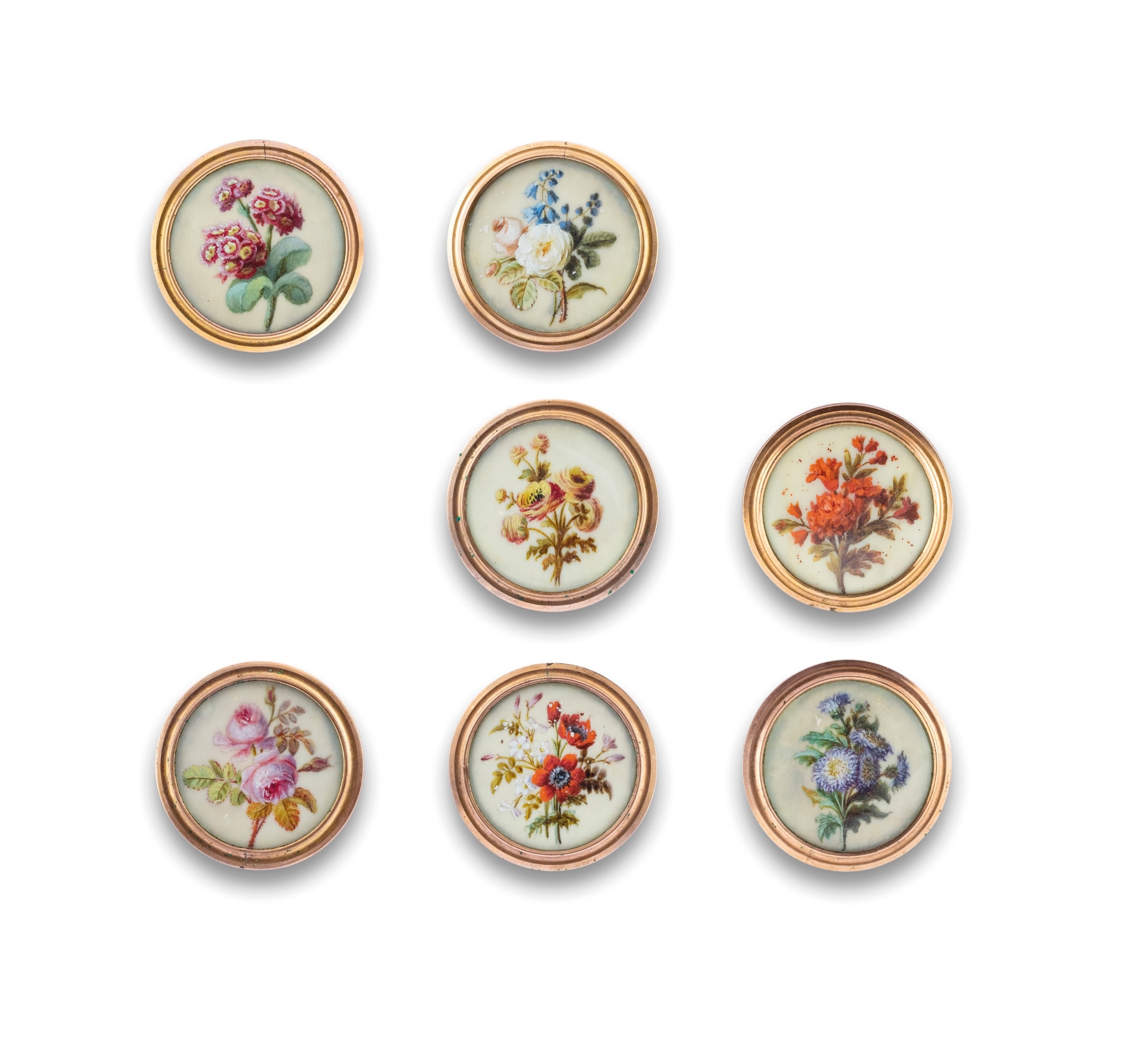 on ivory backed with mother-of-pearl (with shanks for sewing), under glass.